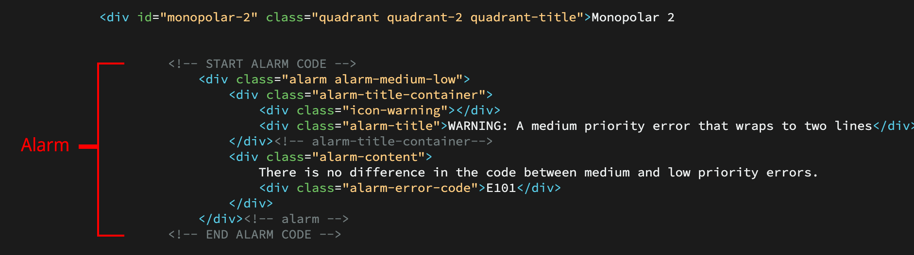 The alarm title and content are then added to their appropriate DIVs. In the Monopolar 1 example, I have added HTML styled bullets to the content to show it is possible, but I'm not clear how alarm content is currently formatted.